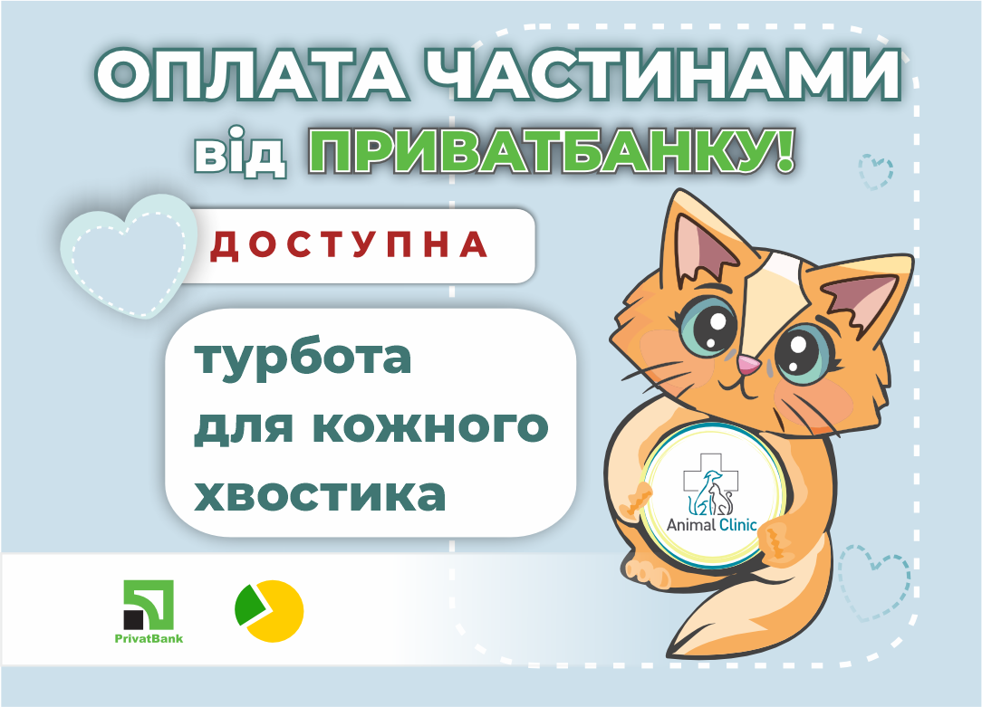 З 1 жовтня 2025 року в усіх філіях мережі ветеринарних центрів Animal Clinic діє сервіс «Оплата частинами» від «ПриватБанку». Це зручний варіант розстрочки: отримати весь обсяг потрібних послуг нашої клініки можна вже сьогодні, а оплату здійснити у декілька платежів протягом певного терміну.